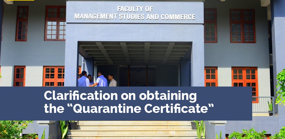 This is in response to the queries received in relation to obtaining the Quarantine Certificate for the purpose of the First Semester End Examinations 2020, following the student notice dated 2020.07.30. Kindly note that you must request for a “Quarantine Certificate” from the respective Public...Read More