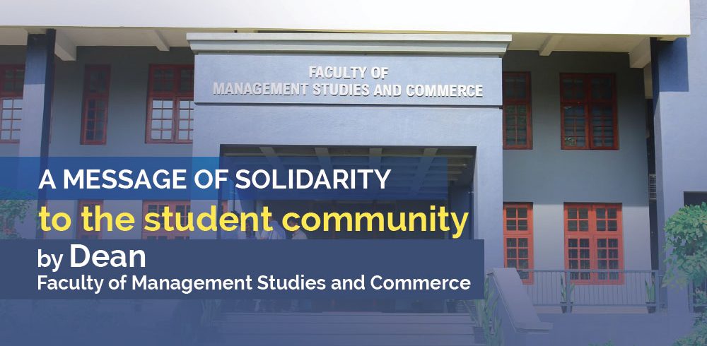 A message of solidarity to our student community at the Faculty of Management Studies and Commerce, University of Sri Jayewardenepura Dear Students, The world today, as one, is experiencing a massive wave of uncertainty at the hands of COVID-19, and we at the Faculty of...Read More