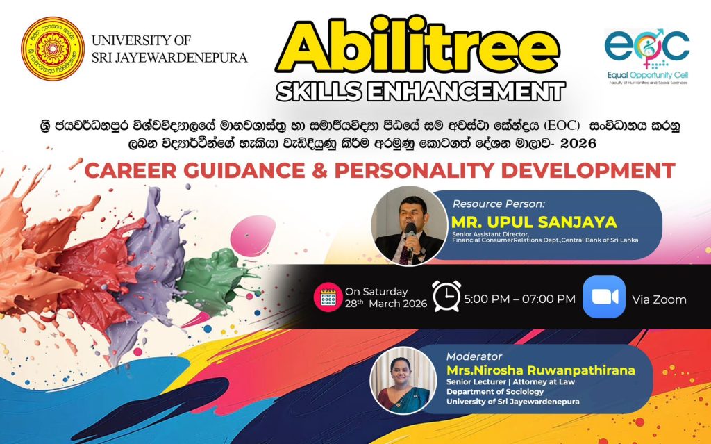 The Equal Opportunity Cell (EOC) of the Faculty of Humanities & Social Sciences, University of Sri Jayewardenepura is organizing the guest lecture :