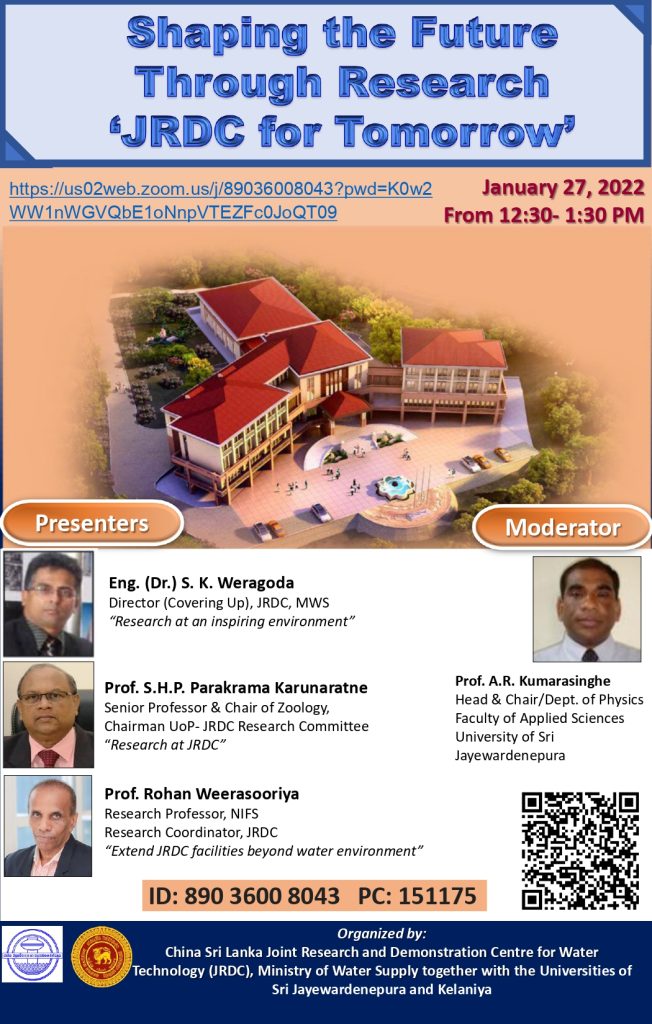 China-Sri Lanka Joint Research Demonstration Center has organized an Introductory Webinar named ‘Shaping the future through Research – ‘JRDC for Tomorrow’ for USJ academics and students on 27th January 2022 at 12.30 pm.